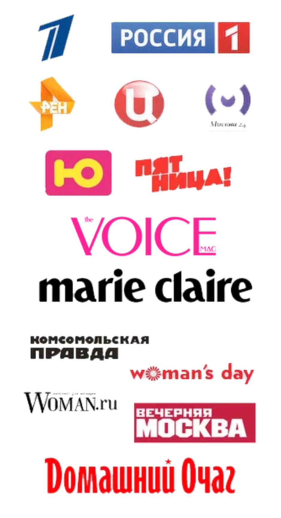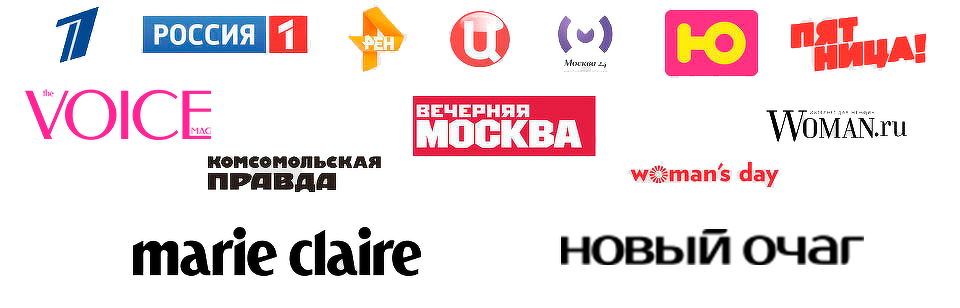 "Voice", "Marie Claire", WOMAN.RU, DNI.RU, "TOPBEAUTY", "Домашний очаг", "Комсомольская правда", "Вечерняя Москва" и многих других.