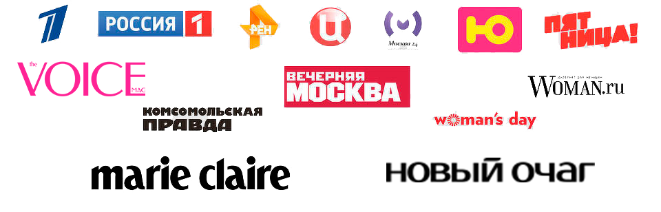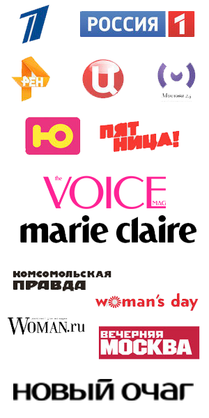 " Voice", "Marie Claire", WOMAN.RU, DNI.RU, "TOPBEAUTY", "Новый очаг", "Комсомольская правда", "Вечерняя Москва" и многих других.
